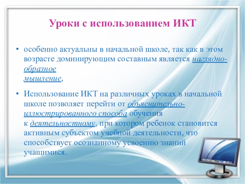 Использование ИКТ на различных уроках в начальной школе позволяет перейти от объяснительно-иллюстрированного способа обучения к деятельностному, при котором ребенок становится активным субъектом учебной деятельности, что способствует осознанному усвоению знаний учащимися.