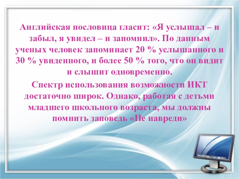 Спектр использования возможности ИКТ достаточно широк. Однако, работая с детьми младшего школьного возраста, мы должны помнить заповедь «Не навреди»