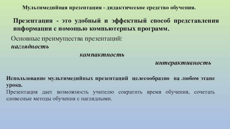 Мультимедийная презентация - дидактическое средство обучения.