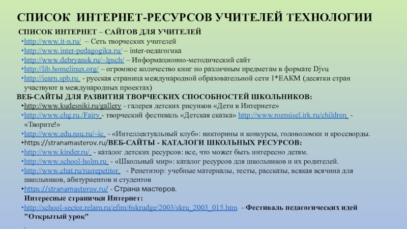 СПИСОК ИНТЕРНЕТ-РЕСУРСОВ УЧИТЕЛЕЙ ТЕХНОЛОГИИ
