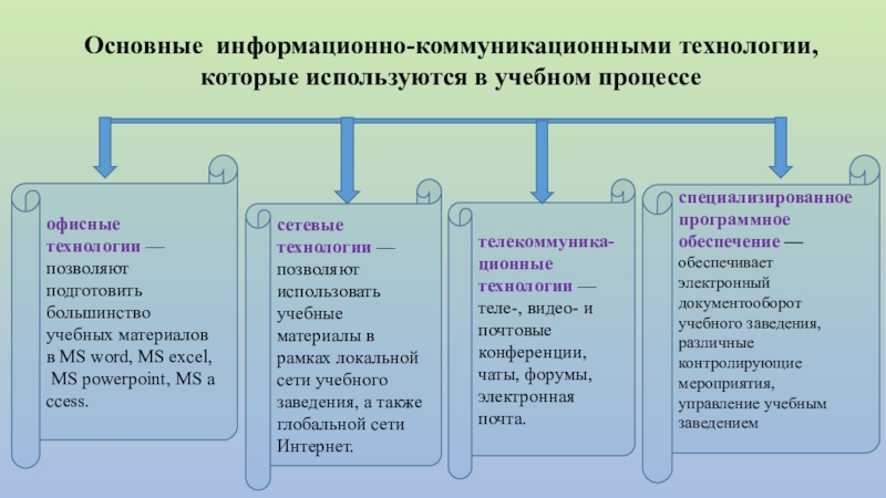специализированное программное обеспечение — обеспечивает электронный документооборот учебного заведения, различные контролирующие мероприятия, управление учебным заведением