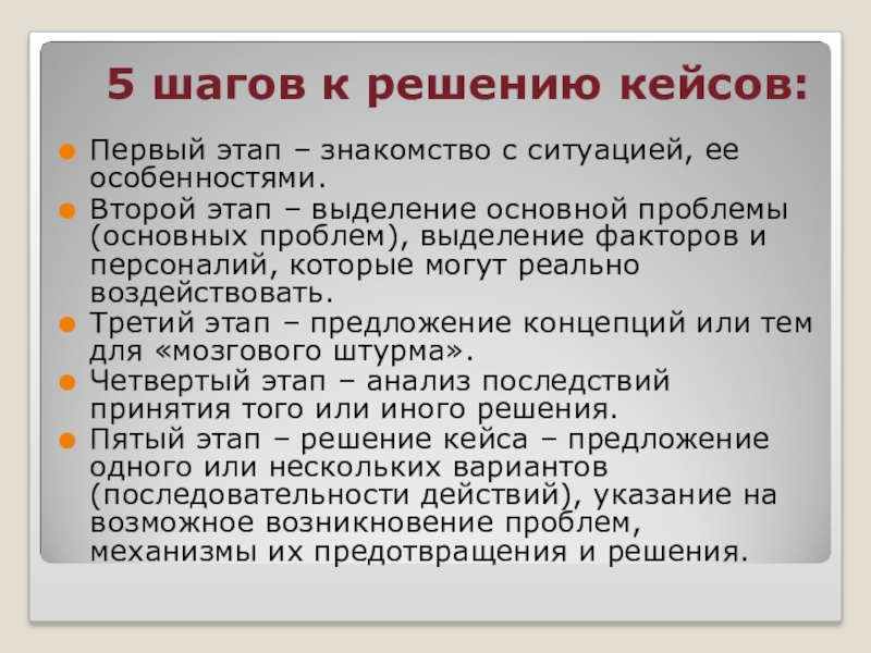 Пятый этап – решение кейса – предложение одного или нескольких вариантов (последовательности действий), указание на возможное возникновение проблем, механизмы их предотвращения и решения.