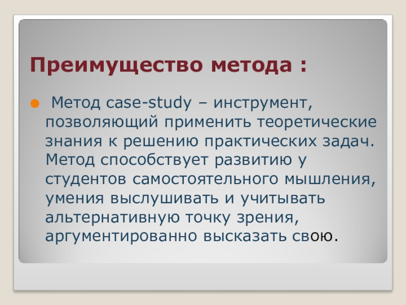 к решению практических задач. Метод способствует развитию у студентов самостоятельного мышления, умения выслушивать и учитывать альтернативную точку зрения, аргументированно высказать свою.