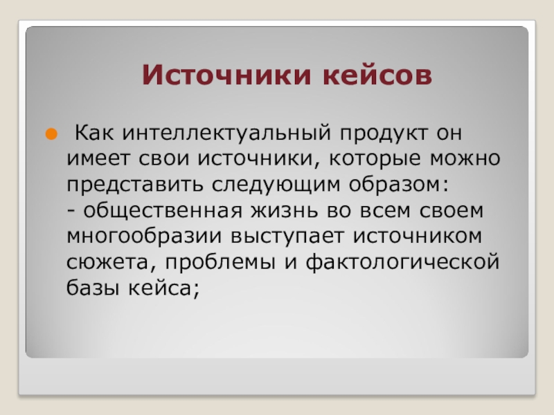 представить следующим образом: - общественная жизнь во всем своем многообразии выступает источником сюжета, проблемы и фактологической базы кейса;