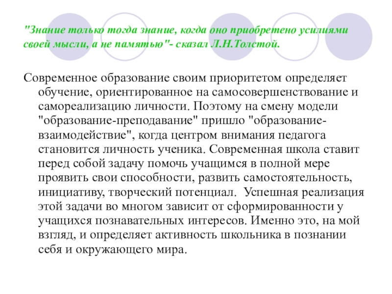 Современное образование своим приоритетом определяет обучение, ориентированное на самосовершенствование и самореализацию личности. Поэтому на смену модели "образование-преподавание" пришло "образование-взаимодействие", когда центром внимания педагога становится личность ученика. Современная школа ставит перед собой задачу помочь учащимся в полной мере проявить свои способности, развить самостоятельность, инициативу, творческий потенциал. Успешная реализация этой задачи во многом зависит от сформированности у учащихся познавательных интересов. Именно это, на мой взгляд, и определяет активность школьника в познании себя и окружающего мира.