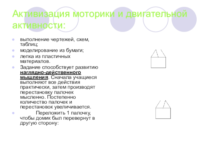Задание способствует развитию наглядно-действенного мышления. Сначала учащиеся выполняют все действия практически, затем производят перестановку палочек мысленно. Постепенно количество палочек и перестановок увеличивается.