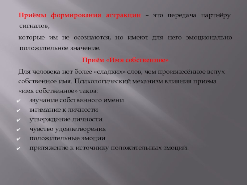 Приёмы формирования аттракции – это передача партнёру сигналов,которые им не осознаются, но имеют для него эмоционально положительное