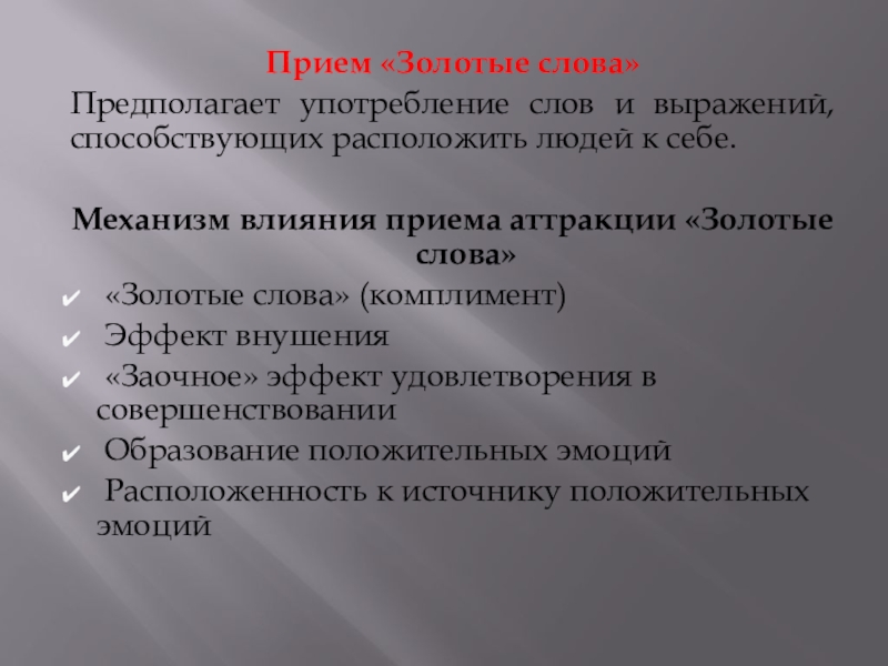 Прием «Золотые слова»Предполагает употребление слов и выражений, способствующих расположить людей к себе.Механизм влияния приема аттракции «Золотые слова»