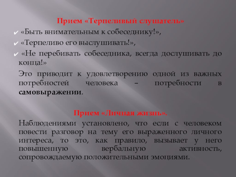 Прием «Терпеливый слушатель» «Быть внимательным к собеседнику!», «Терпеливо его выслушивать!», «Не перебивать собеседника, всегда дослушивать до конца!»Это приводит