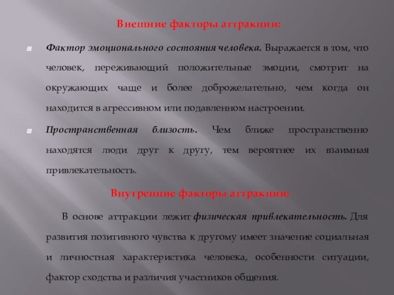 Внешние факторы аттракции:Фактор эмоционального состояния человека. Выражается в том, что человек, переживающий положительные эмоции, смотрит на окружающих чаще