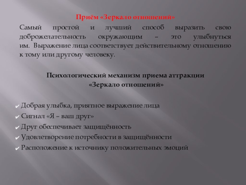Приём «Зеркало отношений»Самый простой и лучший способ выразить свою доброжелательность окружающим – это улыбнуться им.  Выражение лица
