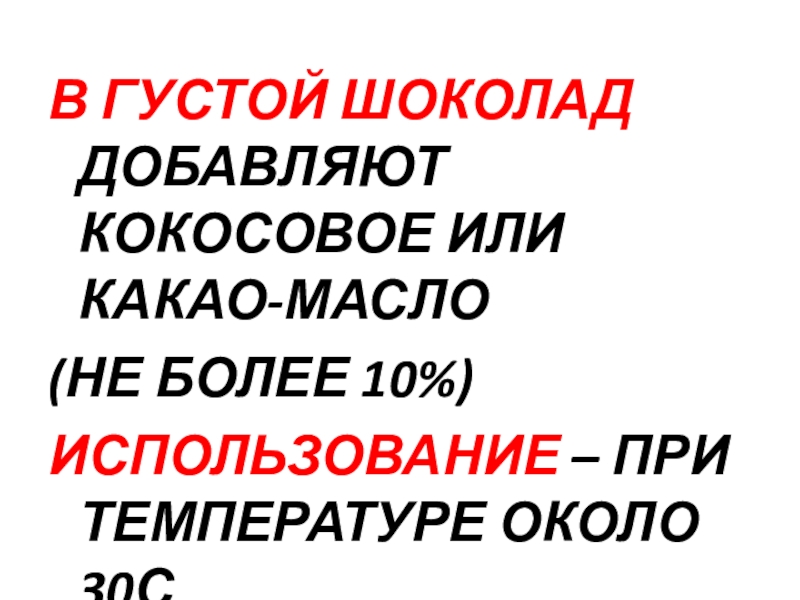 В ГУСТОЙ ШОКОЛАД ДОБАВЛЯЮТ КОКОСОВОЕ ИЛИ КАКАО-МАСЛО (НЕ БОЛЕЕ 10%)ИСПОЛЬЗОВАНИЕ – ПРИ ТЕМПЕРАТУРЕ ОКОЛО 30С