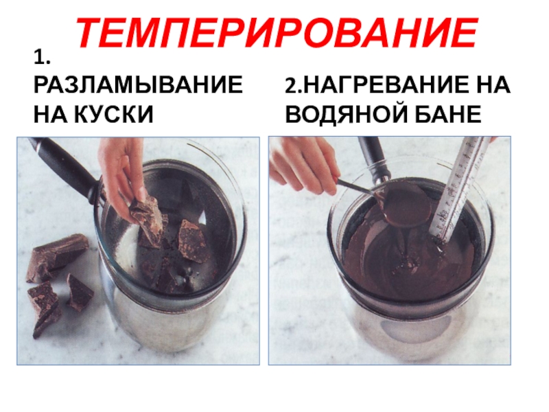ТЕМПЕРИРОВАНИЕ1.РАЗЛАМЫВАНИЕ НА КУСКИ2.НАГРЕВАНИЕ НА ВОДЯНОЙ БАНЕ