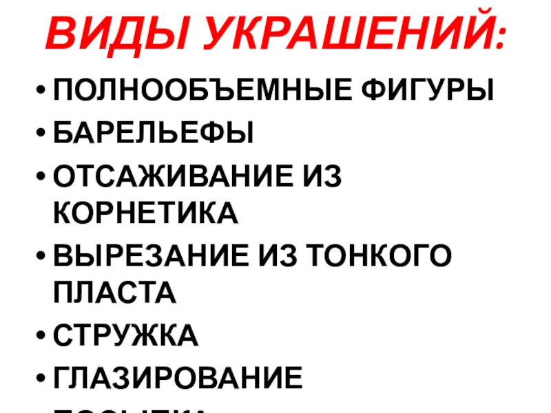ВИДЫ УКРАШЕНИЙ:ПОЛНООБЪЕМНЫЕ ФИГУРЫБАРЕЛЬЕФЫОТСАЖИВАНИЕ ИЗ КОРНЕТИКАВЫРЕЗАНИЕ ИЗ ТОНКОГО ПЛАСТАСТРУЖКАГЛАЗИРОВАНИЕПОСЫПКА