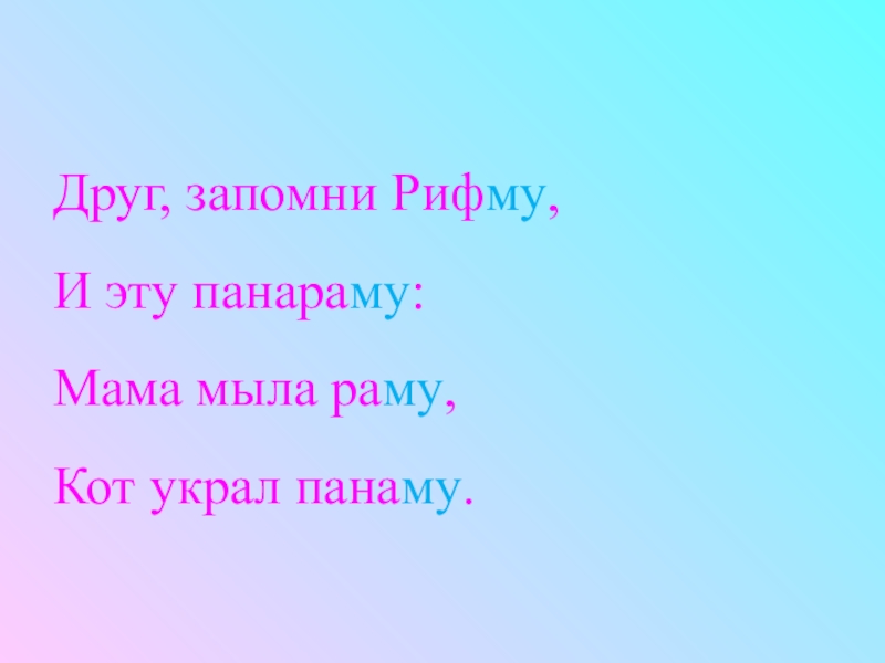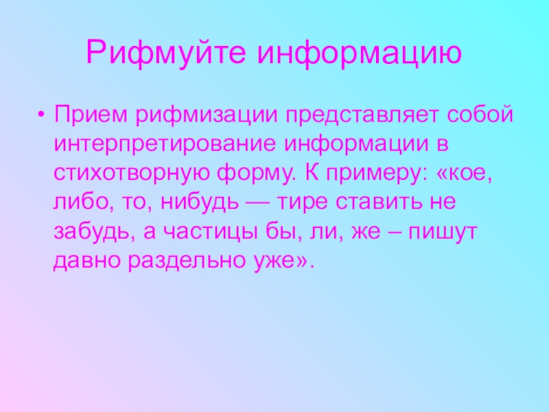 Прием рифмизации представляет собой интерпретирование информации в стихотворную форму. К
