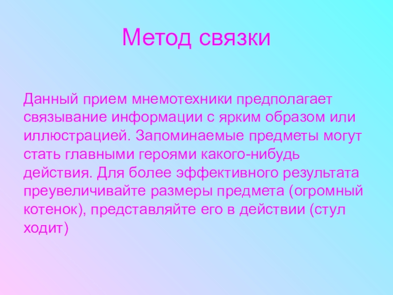 иллюстрацией. Запоминаемые предметы могут стать главными героями какого-нибудь действия. Для более эффективного результата преувеличивайте размеры предмета (огромный котенок), представляйте его в действии (стул ходит)