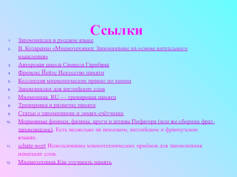 необычных ассоциаций (картинки, фразы), которые соединяются с запоминаемой информацией.