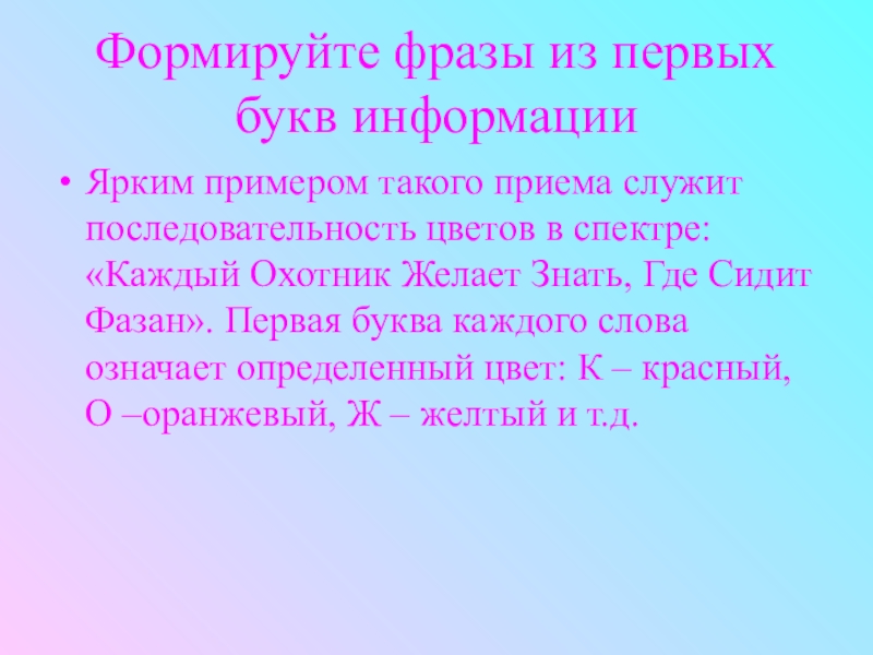 цветов в спектре: «Каждый Охотник Желает Знать, Где Сидит Фазан». Первая буква каждого слова означает определенный цвет: К – красный, О –оранжевый, Ж – желтый и т.д.
