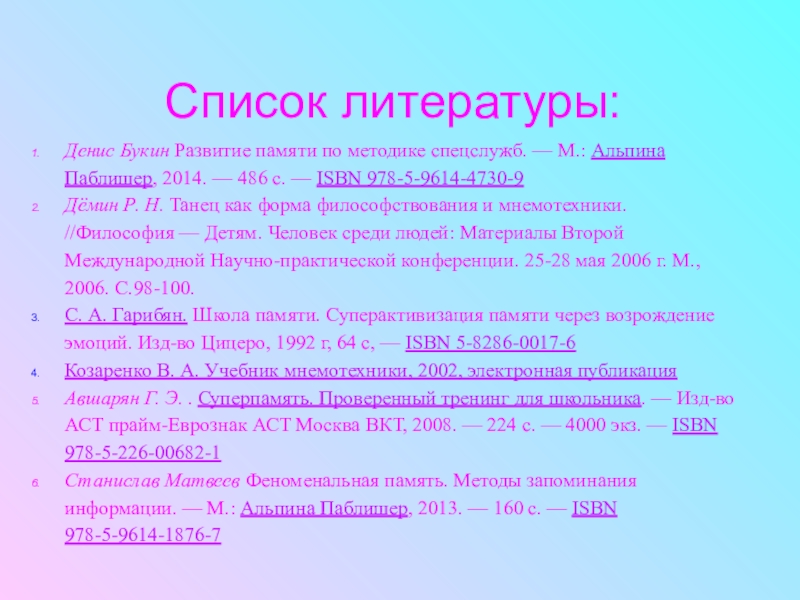Станислав Матвеев Феноменальная память. Методы запоминания информации. — М.: Альпина Паблишер, 2013. — 160 с. — ISBN 978-5-9614-1876-7