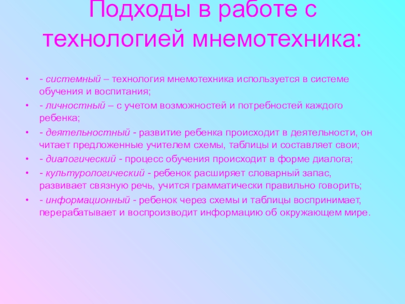 Слайд 5Подходы в работе с технологией мнемотехника: