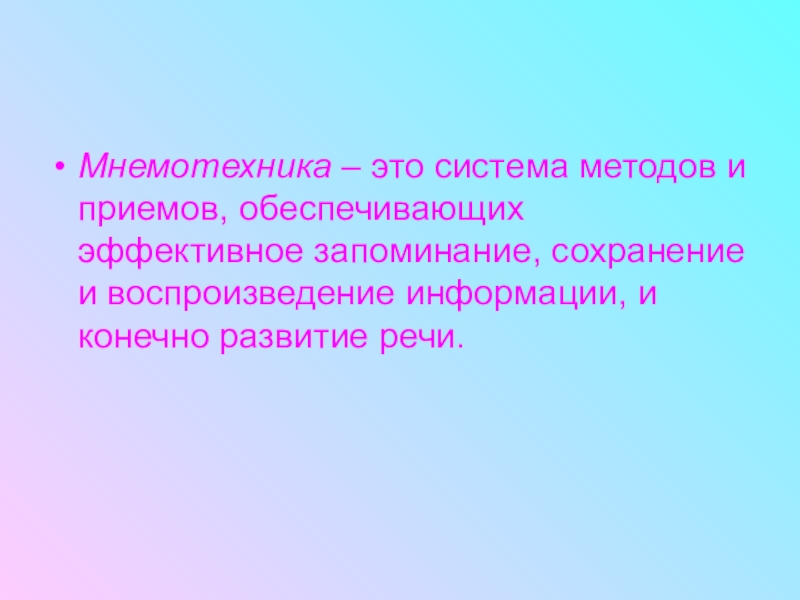 Слайд 3Мнемотехника – это система методов и приемов, обеспечивающих эффективное запоминание, сохранение