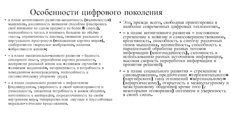 – в плане когнитивного развития – постоянное стремление к новизне и самосовершенствованию, креативность, способность к синтезу различных типов мышления, нелинейность, способность к параллельной обработке разных потоков информации (многозадачность), склонность к использованию разных источников информации, высокая скорость переработки информации и принятия решений;