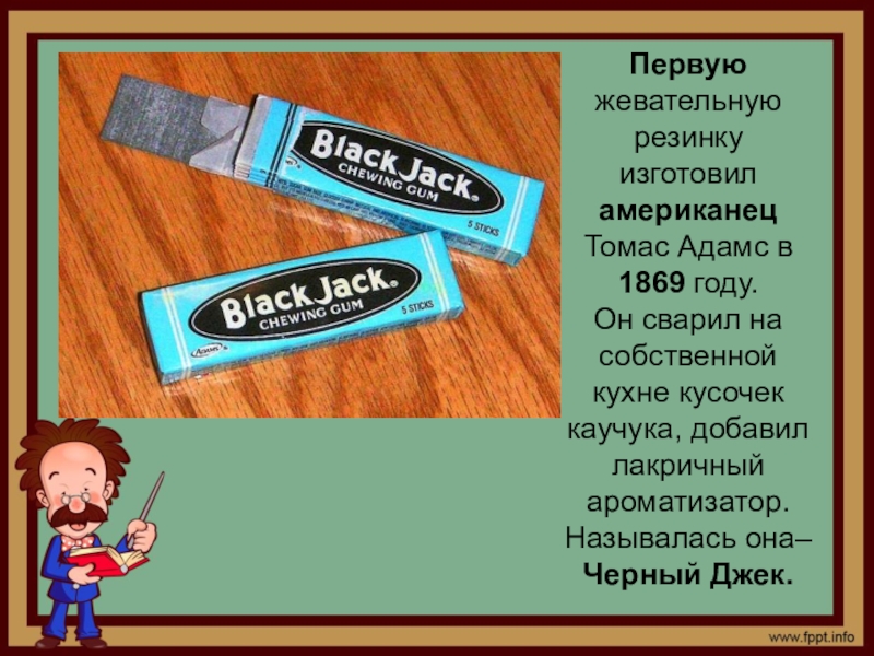 Слайд 12Первую жевательную резинку изготовил американец Томас Адамс в 1869 году.