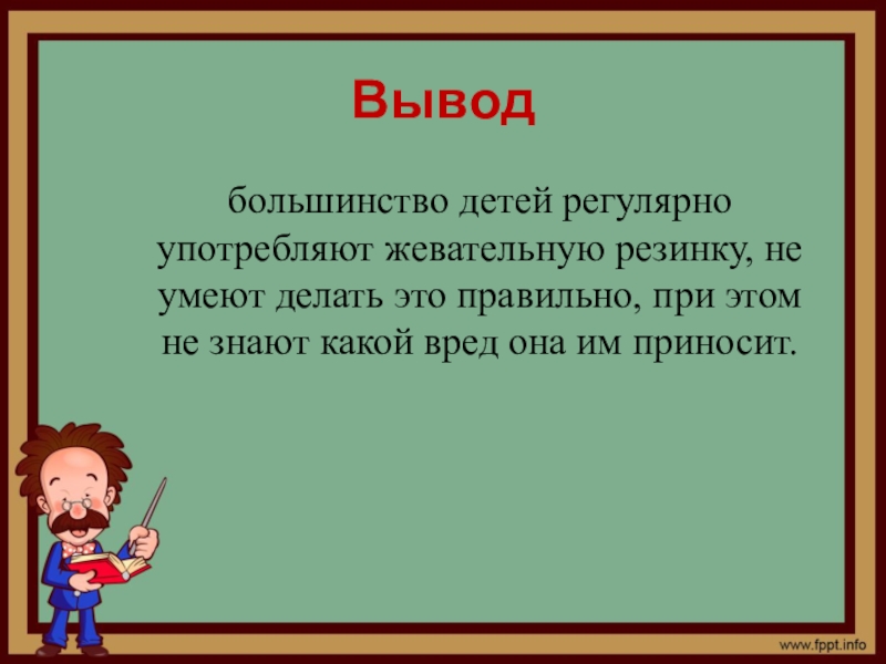 мною была достигнута цель исследования. Я выявили положительное и отрицательное влияние жевательной резинки на организм человека.