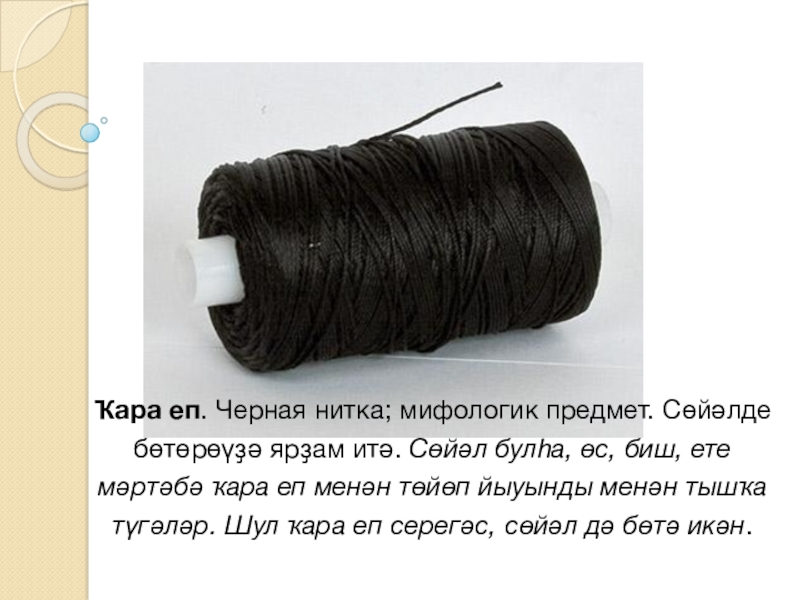 Слайд 15Ҡара еп. Черная нитка; мифологик предмет. Сөйәлде бөтөрөүҙә ярҙам итә. Сөйәл