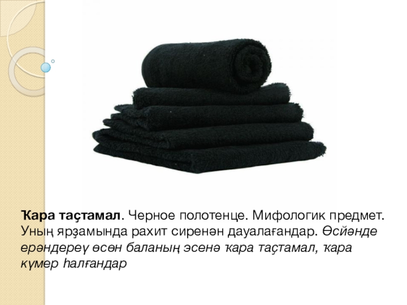 Слайд 20Ҡара таҫтамал. Черное полотенце. Мифологик предмет. Уның ярҙамында рахит сиренән дауалағандар.