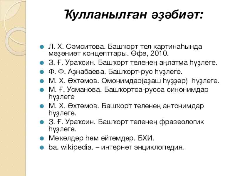 Л. Х. Сәмситова. Башҡорт тел картинаһында мәҙәниәт концепттары. Өфө, 2010.
