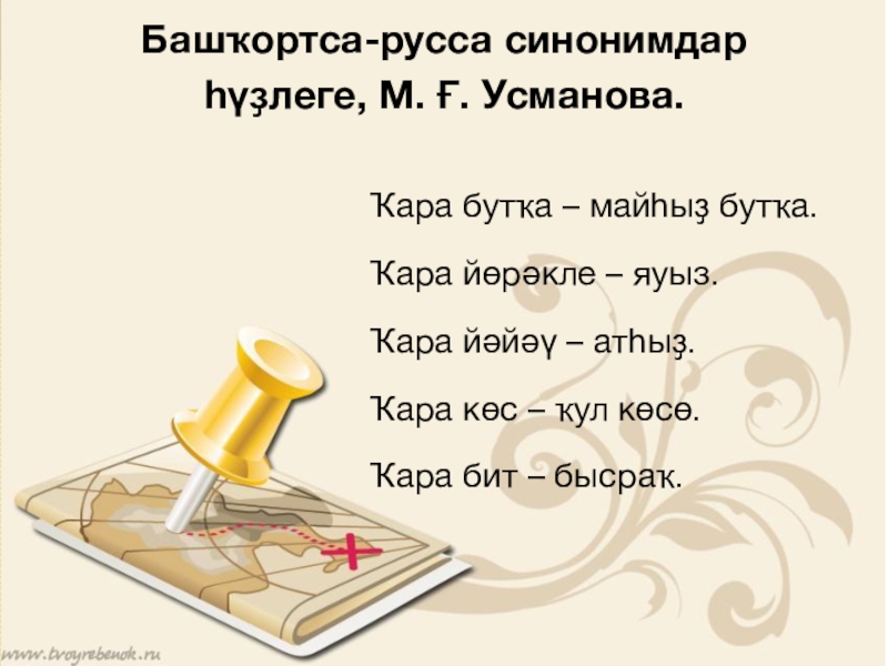 Слайд 6Башҡортса-русса синонимдар һүҙлеге, М. Ғ. Усманова.