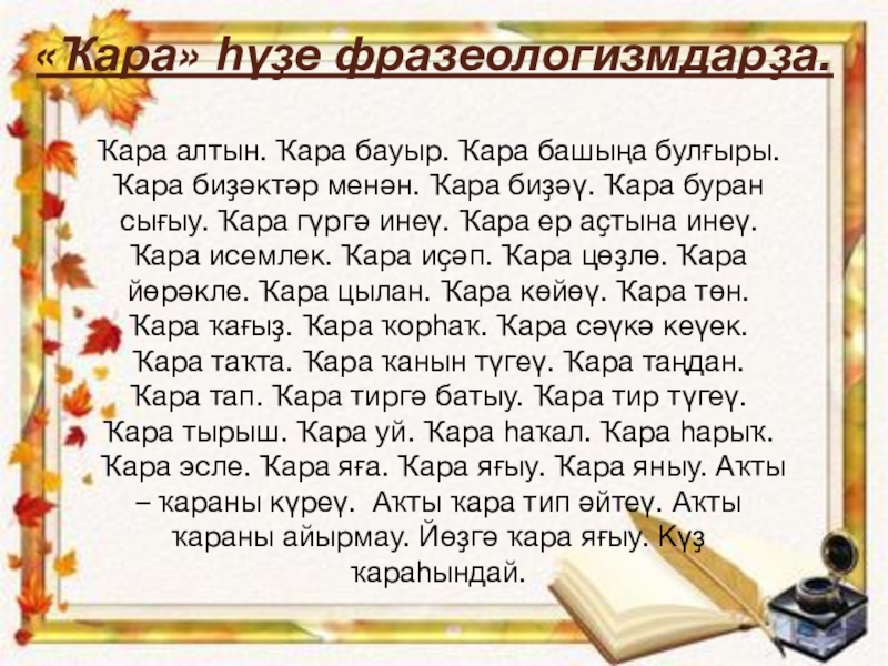 Слайд 9«Ҡара» һүҙе фразеологизмдарҙа.