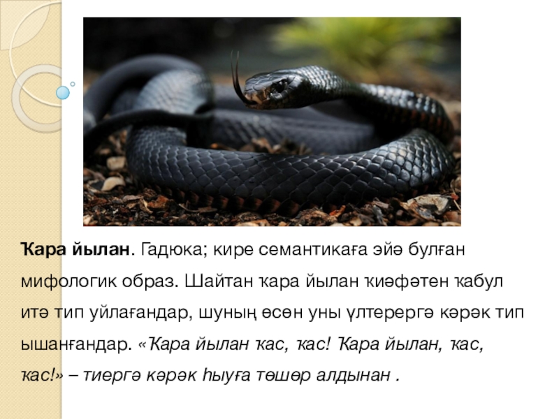 Слайд 16Ҡара йылан. Гадюка; кире семантикаға эйә булған мифологик образ. Шайтан ҡара