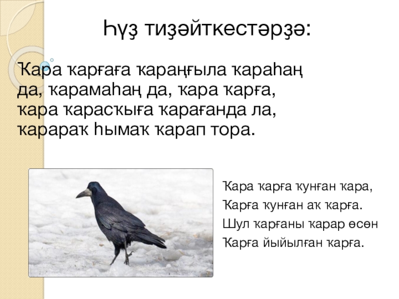Ҡара ҡарғаға ҡараңғыла ҡараһаң да, ҡарамаһаң да, ҡара ҡарға, ҡара
