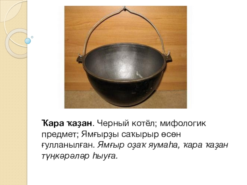 Слайд 18Ҡара ҡаҙан. Черный котёл; мифологик предмет; Ямғырҙы саҡырыр өсөн ғулланылған. Ямғыр