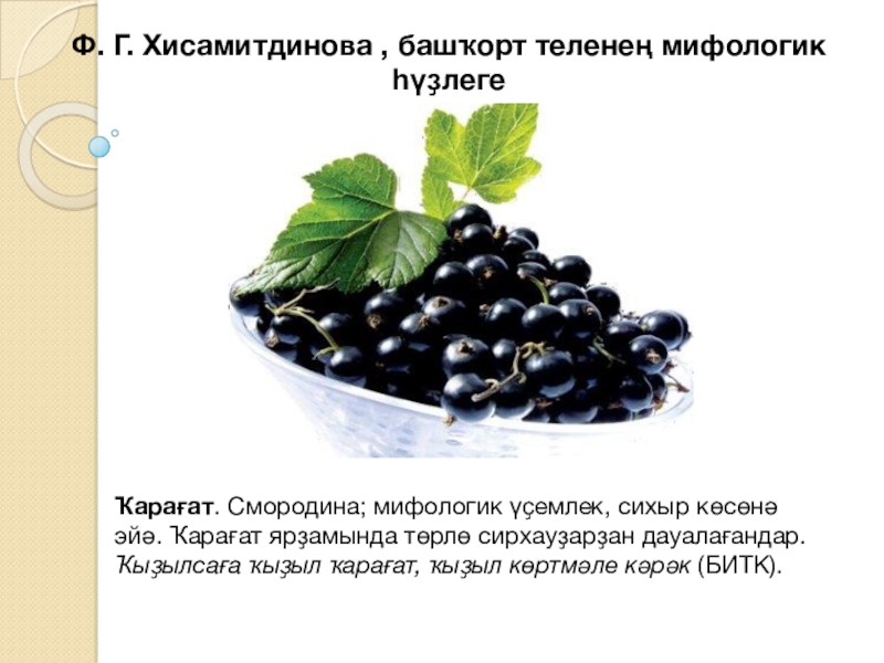 Слайд 14Ҡарағат. Смородина; мифологик үҫемлек, сихыр көсөнә эйә. Ҡарағат ярҙамында төрлө сирхауҙарҙан