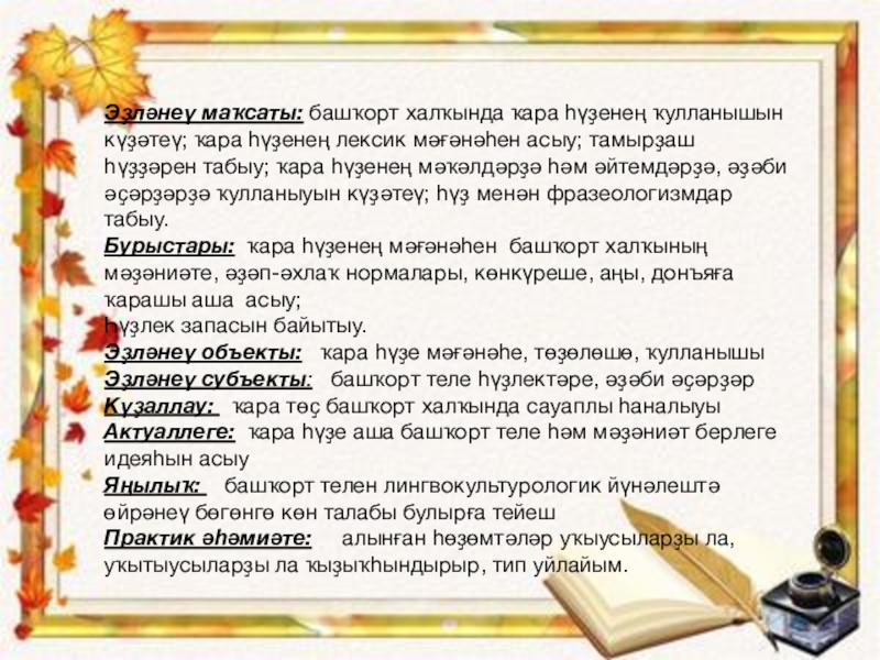 Слайд 3Эҙләнеү маҡсаты: башҡорт халҡында ҡара һүҙенең ҡулланышын күҙәтеү; ҡара һүҙенең лексик