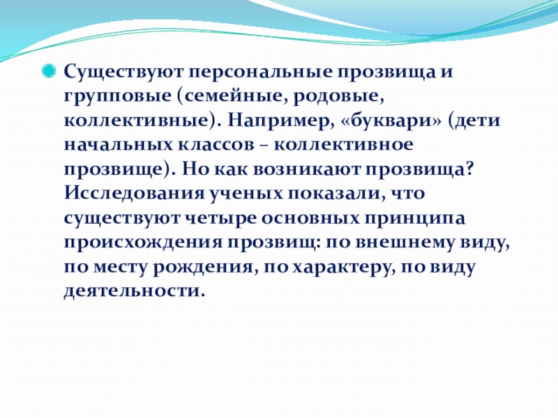 Слайд 10Существуют персональные прозвища и групповые (семейные, родовые, коллективные). Например, «буквари» (дети