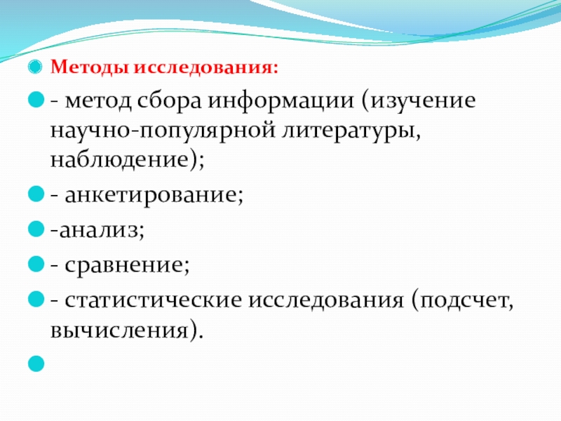- метод сбора информации (изучение научно-популярной литературы, наблюдение);
