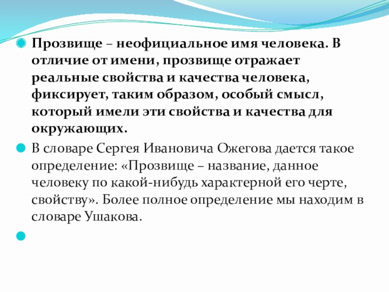 В словаре Сергея Ивановича Ожегова дается такое определение: «Прозвище – название, данное человеку по какой-нибудь характерной его черте, свойству». Более полное определение мы находим в словаре Ушакова.