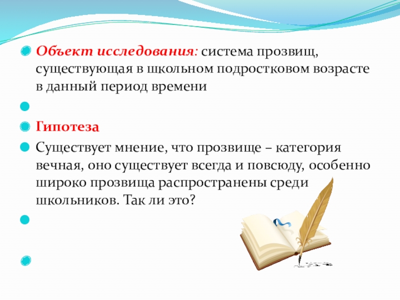 Слайд 5Объект исследования: система прозвищ, существующая в школьном подростковом возрасте в данный