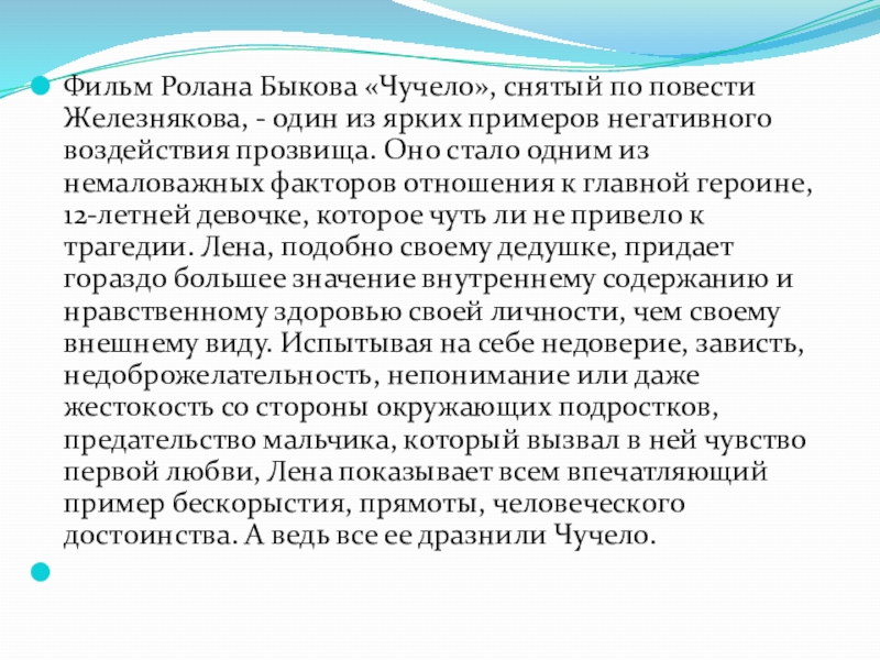 Слайд 13Фильм Ролана Быкова «Чучело», снятый по повести Железнякова, - один из