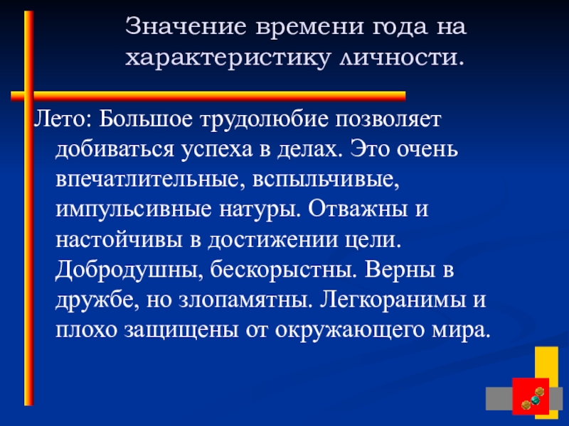 Значение времени года на характеристику личности. Лето: Большое трудолюбие позволяет добиваться успеха в делах. Это очень