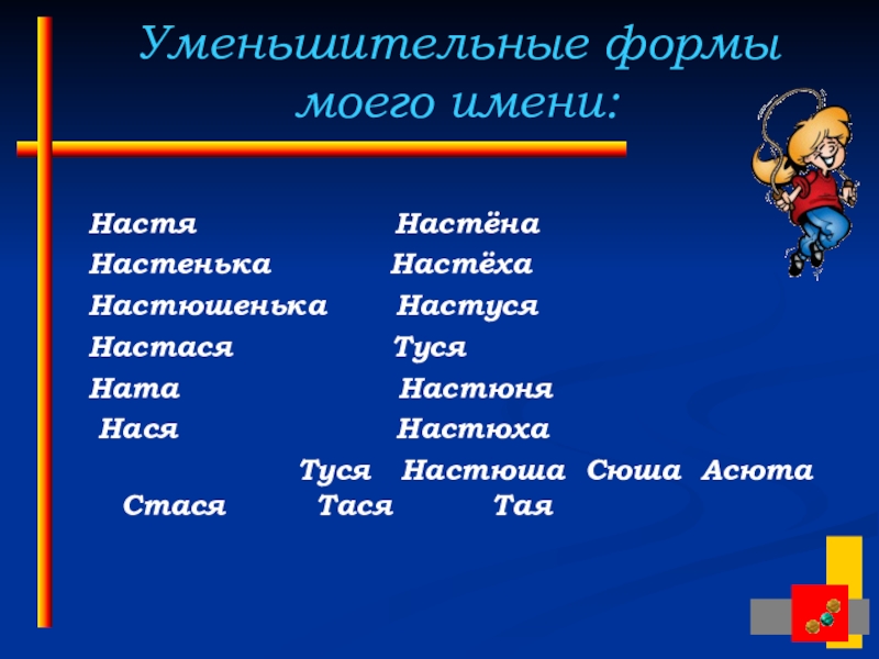 Уменьшительные формы моего имени:Настя          НастёнаНастенька