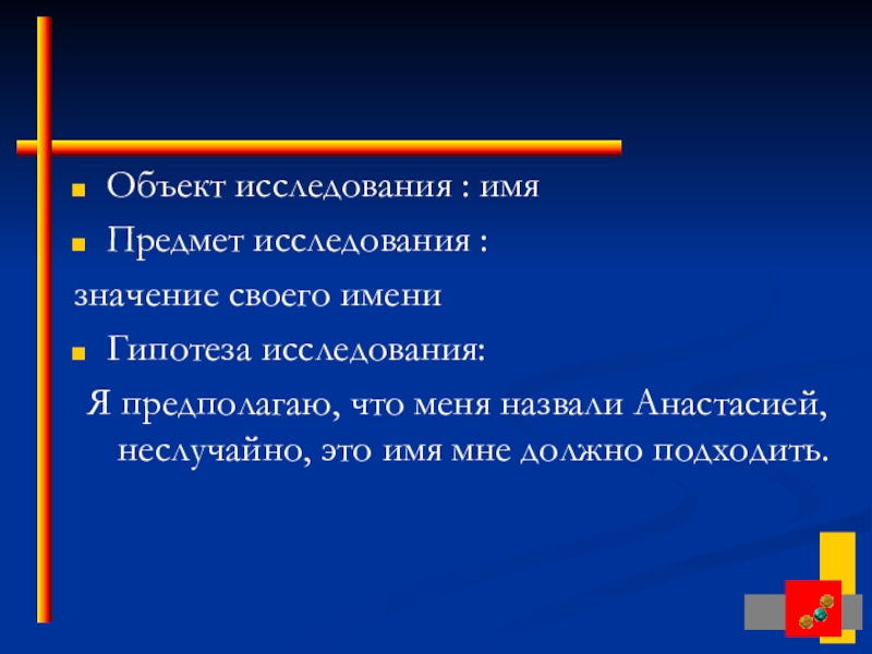 Объект исследования : имяПредмет исследования : значение своего имениГипотеза исследования:Я предполагаю, что меня назвали Анастасией, неслучайно, это