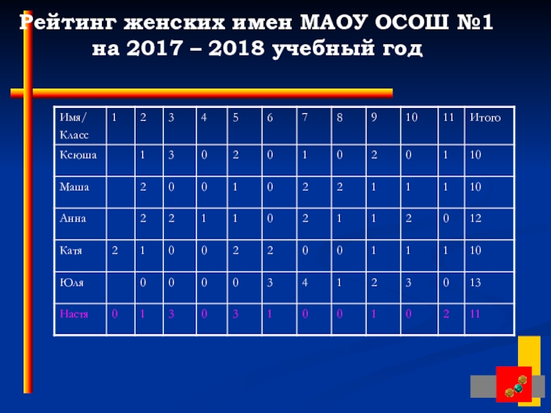 Слайд 8Рейтинг женских имен МАОУ ОСОШ №1 на 2017 – 2018 учебный год