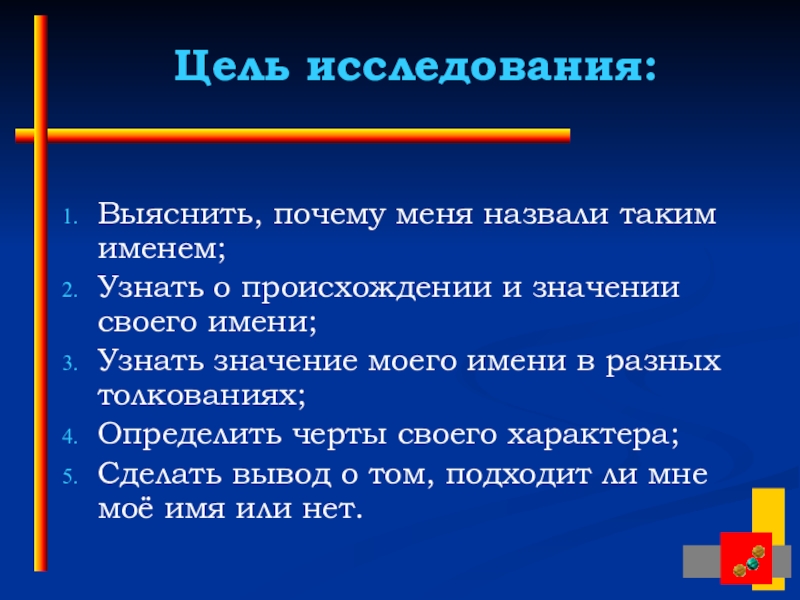 Цель исследования:Выяснить, почему меня назвали таким именем;Узнать о происхождении и значении своего имени;Узнать значение моего имени в