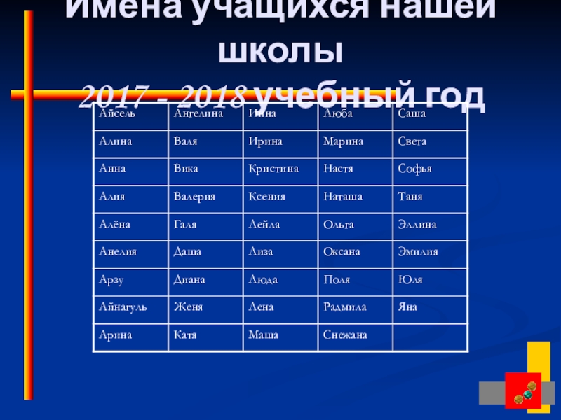 Слайд 7Имена учащихся нашей школы 2017 - 2018 учебный год