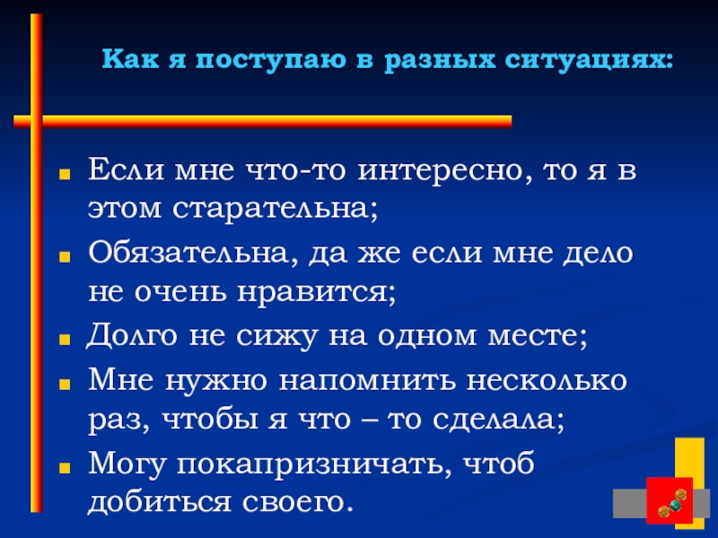 Как я поступаю в разных ситуациях:Если мне что-то интересно, то я в этом старательна;Обязательна, да же если